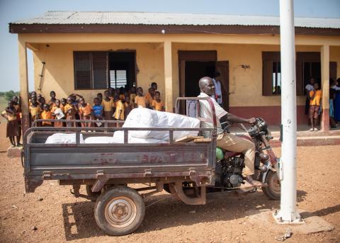 Every other year, Ghana's National Malaria Control Program (NMCP) and its partners conduct school-based mass distribution campaigns to promote the ownership and use of long-lasting insecticide-treated nets (LLINs) to prevent malaria. However, implementation was hindered by the public sector's limited staffing and transportation capacity to carry out such large, nationwide campaigns in the short time required. To complete the last step of the distribution, the NMCP had to have teachers leave the classroom, pick up LLINs from district offices, and bring them back to their students.